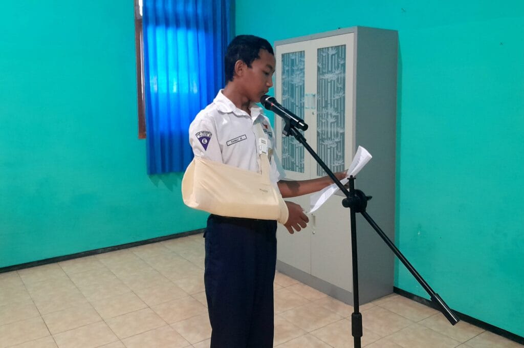 (Keterangan: Foto salah satu peserta ujian praktik bahasa daerah dengan penuh perjuangan setelah memgalami cidera lengan)